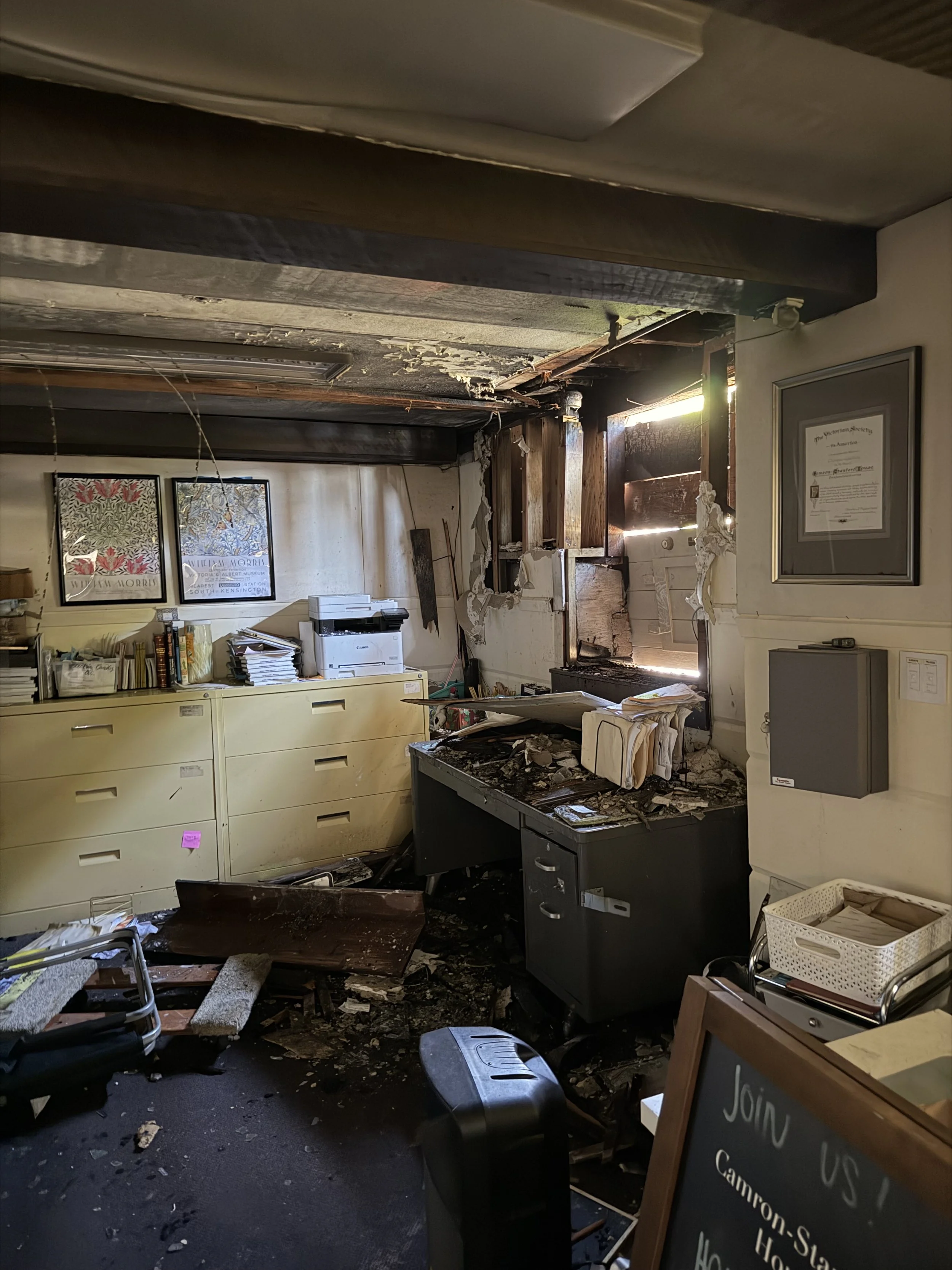 Thanks to the immediate response from the Oakland Fire Department, less than 10 percent of the building was damaged. The house is structurally sound and the historical rooms and artifacts are in tact. The fire started outside of the building and its cause is under investigation. The cost to repair is currently unknown but will be substantial. We are asking the community for donations to assist with restoration and reopening. See link to donate below.